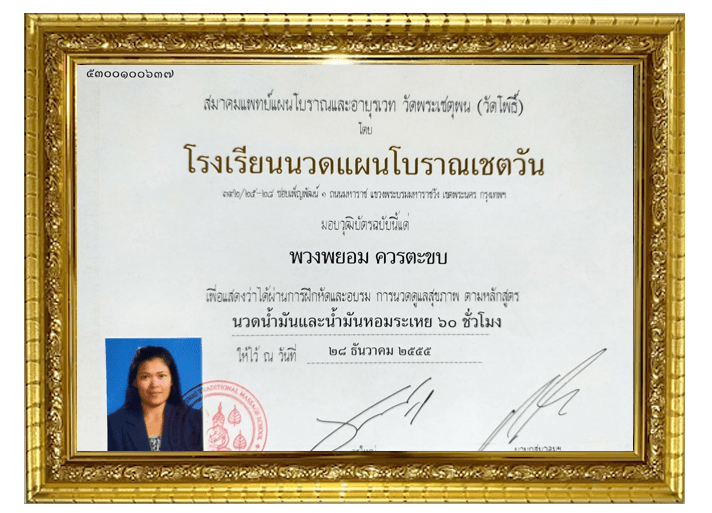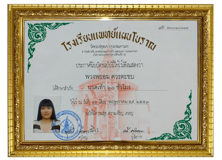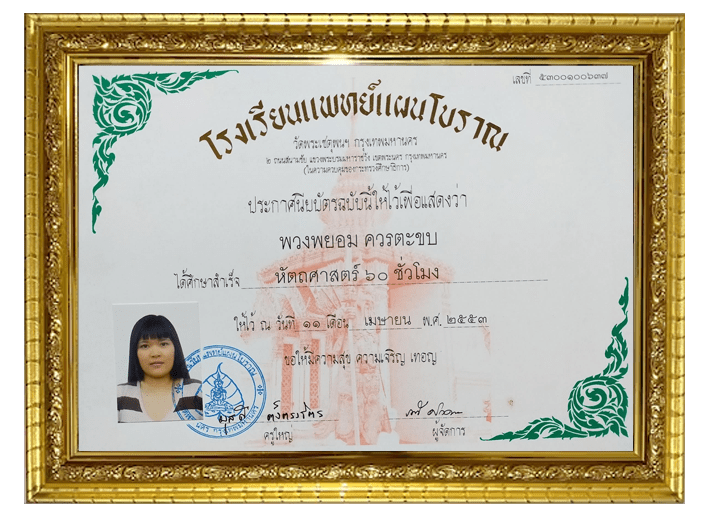 J’ai obtenu mon diplôme de massage en 2010 à l’école Wat Pho, le temple le plus renommé de Thaïlande et la référence mondiale pour l’apprentissage des différents types de massage. Des élèves du monde entier viennent s’y former.